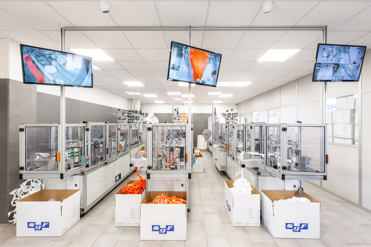 Oggi SGF Automazioni, grazie ad ulteriori investimenti, ha ampliato le proprie aree produttive ed i propri servizi, installando n°3 linee produttive per la produzione di Mascherine FFP2 NR.